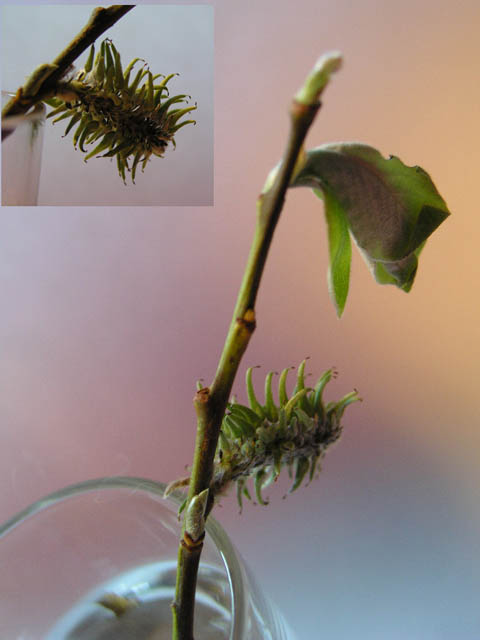 das war auch mein erster gedanke! zum einen der weidenblatt"ähnliche" austrieb und das sehr an weiden erinnernde ästchen, zum anderen eindeutig die abgeblühten weidenkätzchen, die in diesem stadium schon mal verwirrung auslösen können.näher kann man das aber aufgrund des vorliegenden bildes nicht bestimmen.