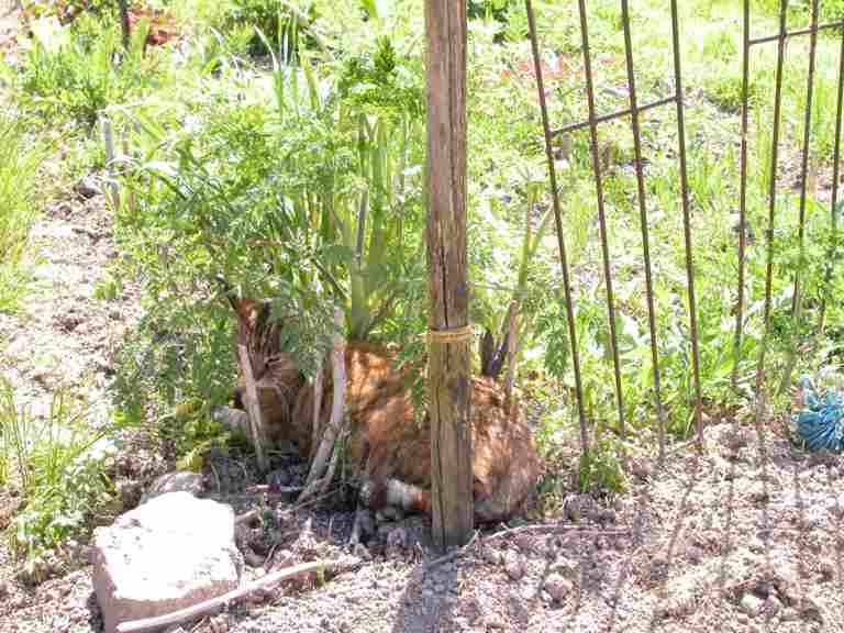 Diese Hitze hält keine Katz lange aus......Wenn man aber unbedingt in meiner Nähe bleiben will,während ich draussen arbeite, nimmt man auch mal mit solch einem exotischen Platz, eingepfercht zwischen den spriessenden (Purpur-)Spargeln, beschattet von einer zur Blüte kommenden Kerbelrübe, vorlieb.