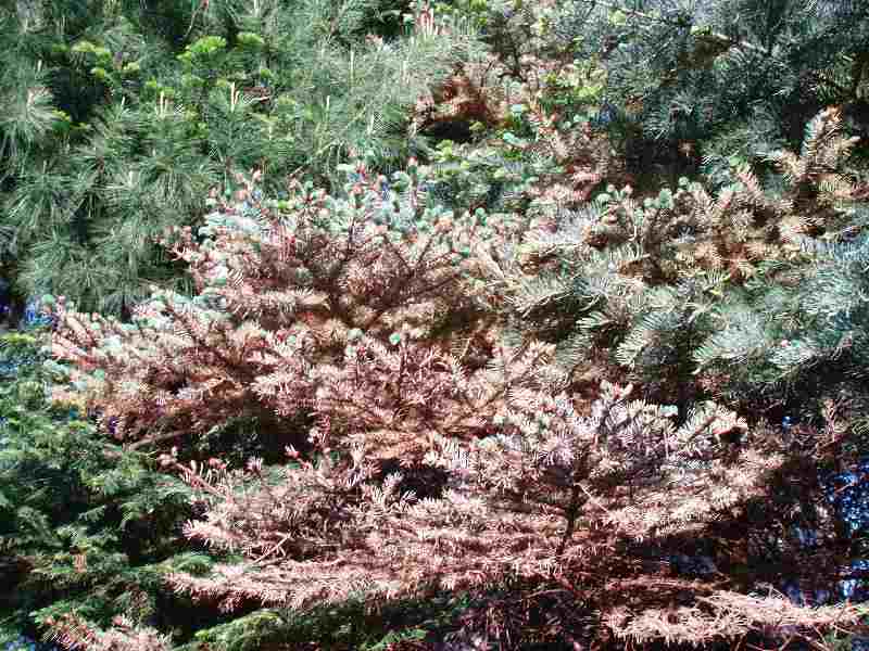 Unserem Nachbarn haben die Sitkaläuse eine Blaufichte kahl gemacht. Im Bild ist links eine grüne Kiefer und rechts eine grüne Coloradotanne zu sehen. Die Blattläuse haben sich auf die Fichte beschränkt. Der Maiwuchs kommt durch. Der Baum wird es vermutlich überleben.Viele GrüßePeter