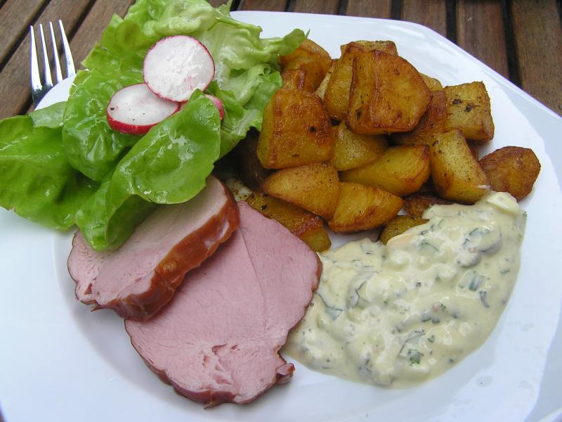 gerade gab es geräucherter burgunderrollbraten mit bratkartoffeln aus rohen kartoffeln, selbstgemachte remoulade und gartensalat mit gartenradieschen