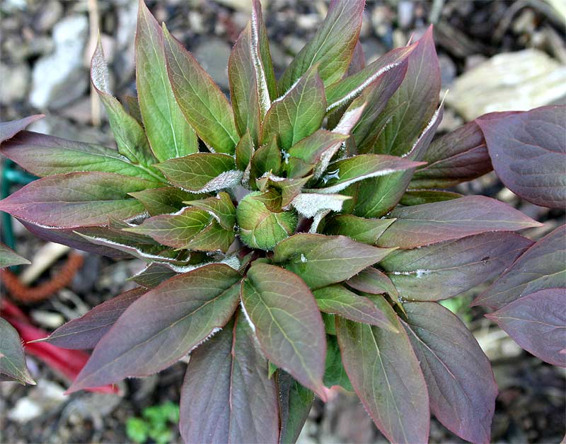 das Laub von 'Spartana' ähnelt sehr P. steveniana, hat mit Mloko nichts zu tun. Außerdem hat sie hast waagerecht verlaufende tuberöse Wurzeln, die wie Ausläufer wachsen und aus jedem Teilstück treiben.Das mit den waagerechten Wurzeln habe ich bei Steveniana auch gelesen.Ich vermute, es ist eine offene Absaat von P. steveniana gewesen, also eine F1-Hybride, weil die Sorte völlig steril ist.Bei mir war die Sorte am ersten Pflanzplatz unter einem Flieder völlig zusammengebrochen und ich habe alle Wurzelstücke penibel ausgegraben und in Reihen neu aufgepflanzt. Mittlerweile treiben sogar die Blindstücke ohne Augen fast komplett aus. Eine schöne Sorte zur Vermehrung, aber etwas pilzanfällig.Das Laub ist besonders im Austrieb sehr schön, wird nach der Blüte grüner.Ähnlich im Laub ist auch PCO No. 5 und PCO No. 7, 2 Sorten aus Dänemark. Und die sind nachweislich Kreuzungen von P. steveniana.