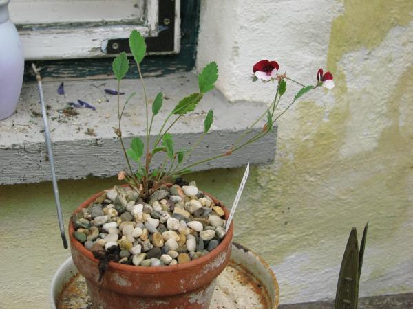 rechts vorne im Bild sieht man noch Blätter des Pelargoniums "Crocodile"
