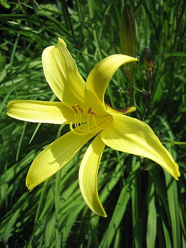 Eben nicht. Auf Plodecks Seite habe ich mich schon öfters umgesehen, welche andere in Frage kommen könnte, aber entweder passt die Farbe nicht oder bei H. middendorffii finde ich auch, dass die Petalen meiner zu schmal sind. Beschreibungsgemäß soll sie auch fast geruchslos sein, was ich von meiner nicht sagen könnte. Leider hat Dr. Plodeck nicht überall Bilder dabei.Noch ein Seitenportrait:Die H. middendorffii ist sehr leicht zu identifizieren, da bei ihr die Knospen am Stengelende ohne Verzweigung in Hüllblättern wie in einem Körbchen sitzen. Ist das bei dir der Fall?