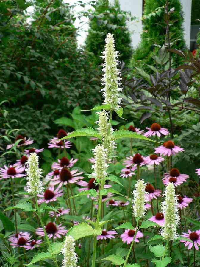 Und da sind wir auch schon bei den Agastachen. 'Alabaster', 'Black Adder' etc. sehen in dieser Zeit auch phantastisch aus.Hier Alabaster mit Sonnenhut Ende Juli.Der Sonnenhut sieht im August dann allerdings schon recht herbstlich aus...