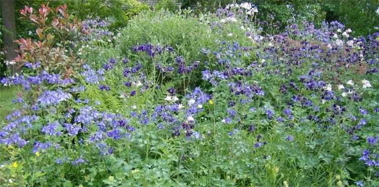 Es handelt sich um die beiden Wildarten Aquilegia vulgaris (kommt bei uns in der Eifel vor und blüht blau) und um Aquilegia atrata aus den Alpen (blüht dunkelviolett).Diese Arten keimen "sortenecht", und säen sich aus wie wild. Und da ich keine anderen Akeleienarten habe, können sie auch nicht mit anderen Farben hybridisieren.wallu - deine akeleien sind die wucht 8)dieses berauschende konzert in blau - wo gibbet die???????![]()