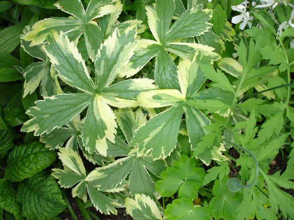 Diese habe ich letzten Monat als 'Polygonatum variegata' gekauft, obwohl ich bereits eine andere als 'variegata' (weissgerandete Blätter) hatte. Ist wohl auch richtig 'striatum'. Und ja, Astrantia, die Blätter sind auch krumpelig.Polygonatum x hybridum 'Grace Barker' (syn. P. x hybridum 'Striatum')