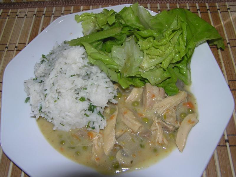 hühnerfrikassee mit kräuterreis und einer großen schüssel kopfsalat mit zitronendressing