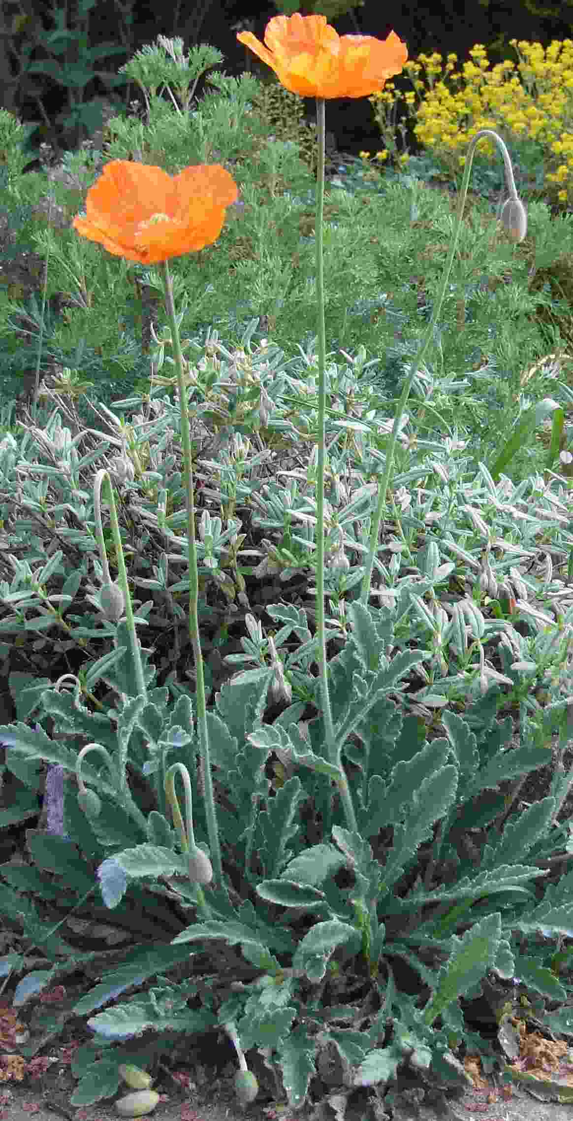 Islandmohn ist der kräftigste in der Farbe, macht sich nach der Blüte aber bei mir immer schnell vom Acker. Wirklich ausdauernd, wenn man ihn vor der Samenbildung straff (bis fast auf den Boden) zurückschneidet oder -rupft, ist Papaver atlanticum, der Marokko-Mohn. Er wird nur etwas höher, blüht licht-orange, bildet eine schöne dichte, graugrüne und behaarte Rosette.Wenn man keine Lust hat, ständig abgeblühte Stiele auszubrechen, hilft ebenfalls wiederholtes "deadheading". Versamt sich tausendfach.