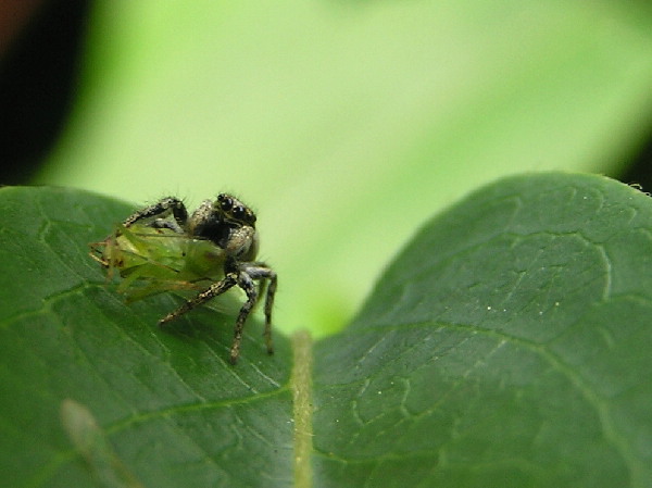 herbstliches Grün - IIITäter: Zebraspringspinne, 5 - 7 mmOpfer: vermutlich punktierte Zartschrecke