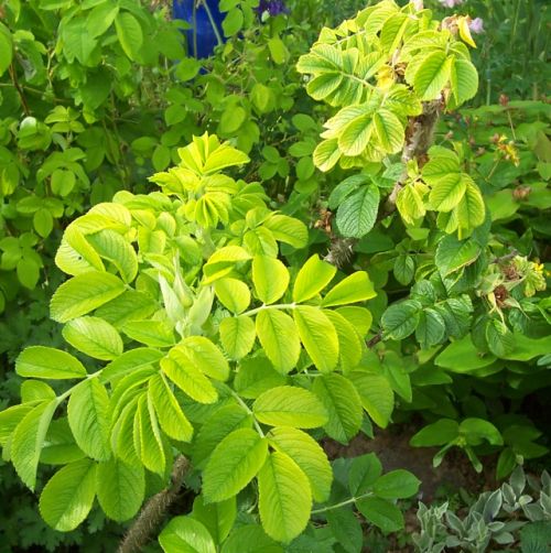 Nicht nur ein zu hoher pH-Wert, auch ein verdichteter und staunasser Boden führt zu Mangelerscheinungen wie Chlorosen. Daher ist gerade für die chloroseanfälligen Rugosas eine tiefe Bodenlockerung vor der Pflanzung sinnvoll. Hier steht etwas über Abhilfe unter Blattverfärbungen.Besonders im Weinbau wird viel darüber geforscht, beispielsweise hier .