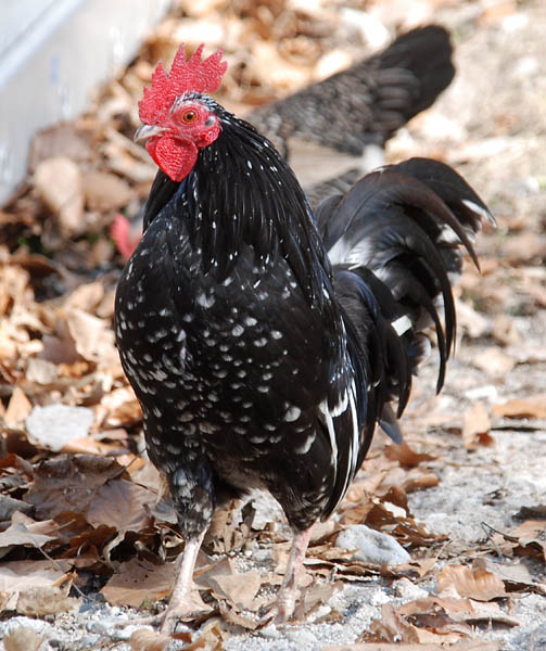 Da hast du Recht. Seine unregelmässigen Punkte und das blaue Schimmern fügt sich zu einem verwegenem Ganzen zusammen. Und seine unbefiederten Beine lassen ihn schlank und leichtfüßig wirken. Im Vergleich zu den anderen Hähnen ist er auch viel leichter. Trotzdem hat er sich mindestens eine Henne gesichert, die er herumführt und der er Leckerbissen zeigt.