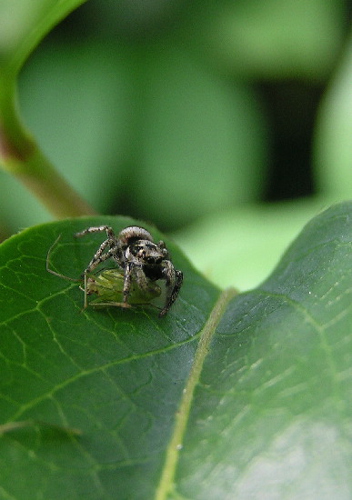 herbstliches Grün - IIITäter: Zebraspringspinne, 5 - 7 mmOpfer: vermutlich punktierte Zartschrecke