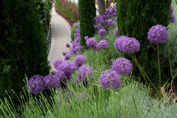 Allium Ambassador, sah in Verbindung mit Lavendel und Santolina sehr ansprechend aus