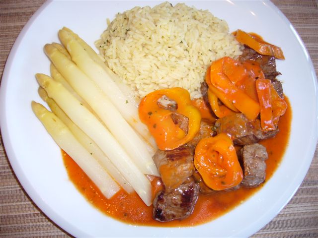 es gab:Blattsalatkurzgebratenes Rindfleisch an einer Paprikasauce, Reis und Spargel