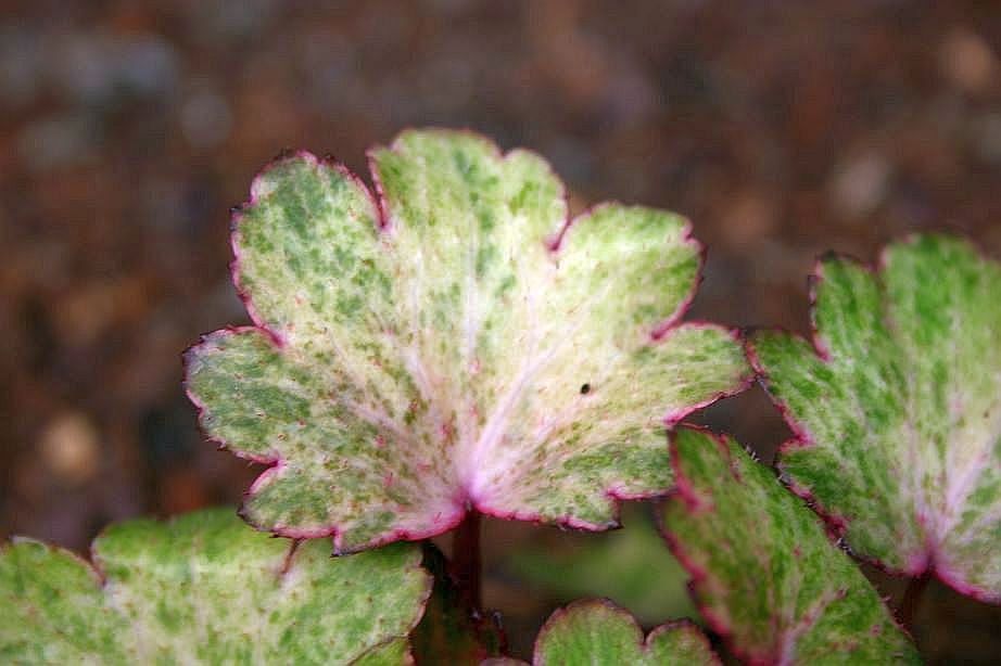Ein tolle Blattzeichnung hat Saxifraga cortusifolia var. fortunei 'Crystal Pink'. Hoffentlich kommt die Blüte im Spätherbst auch so schön daher (Frostgefahr!)