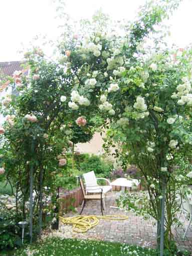:Habe heute in der Gärtnerei Hartwig in Gundelfingen bei Freiburg diesen tollen Bogen fotografierenn dürfen. Habe sogar richtig geraten, links Abraham Darby, rechts ein kletterndes Schneewittchen, das tatsächlich stachellose Hauptäste hatte, ein ungewohnter Anblick. Die waren leicht grünlich, wie von einer hauchdünnen Moosschicht überzogen, hat mir gefallen.