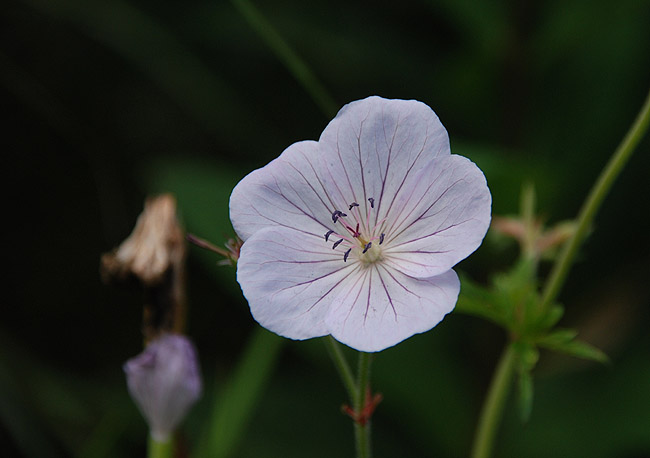 Meine schönste Pflanze ist im Moment ein Sämling aus dem Gärtnerei-Areal von Sarastro. Verrückt wie ich bin, habe ich einmal sämtlich Sämlinge, die ich gefunden habe, getopft und hier gepflanzt. Die meisten sind langweilig blau und kleinblütig, andere sehen aus wie wilde G. pratense, andere gleichen der Sorte 'Mrs. Kendall Clarke', aber ein paar wenige stechen heraus. Dieser hier am allermeisten, er ist im Schwimmblütenfoto von vorhin links zu sehen, einer der größten. Er ist blassblau, zur Mitte hin heller und hat dunkle Adern. Allerdings wird er hoch und ich vermute, er fällt in fetten, feuchten Böden um.