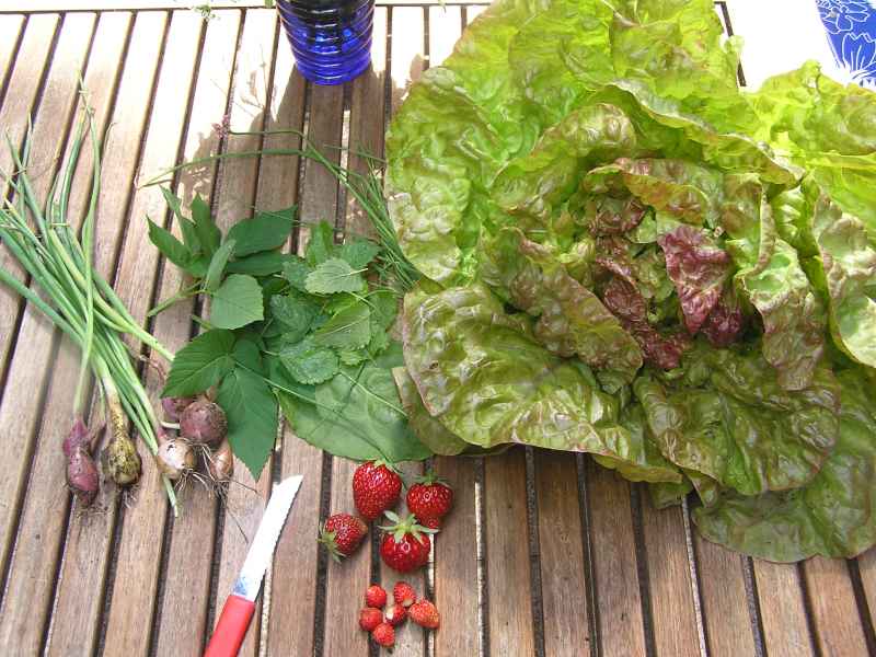 gestern: einen wunderschönen salatkopf, salatkräuter, frühlingszwiebeln, ein paar erdbeeren und ein paar walderdbeeren