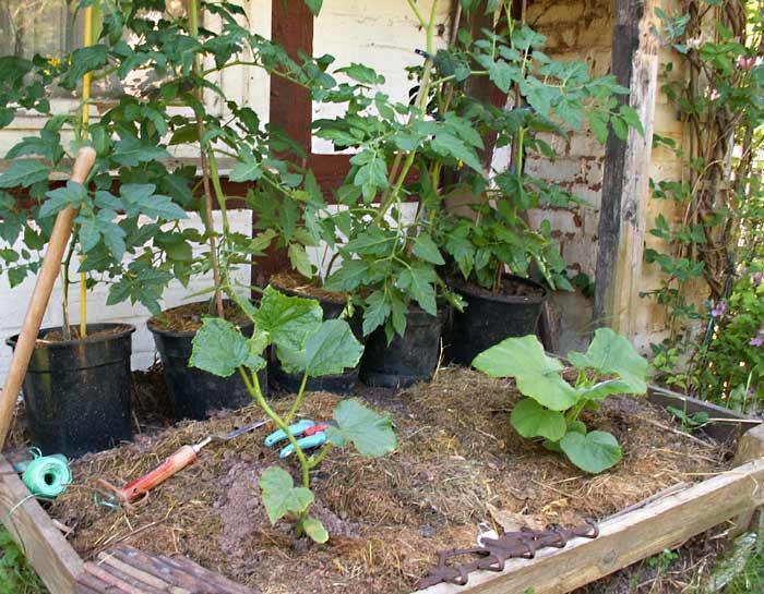 Auch der einjährige Komposthaufen ist bepflanzt. Eine Salatgurke und noch ein Butternut-Kürbis wachsen bisher recht gut. Der hintere Teil des Kompost ist überdacht, schlecht für den Kompost, aber gut für die Tomaten.