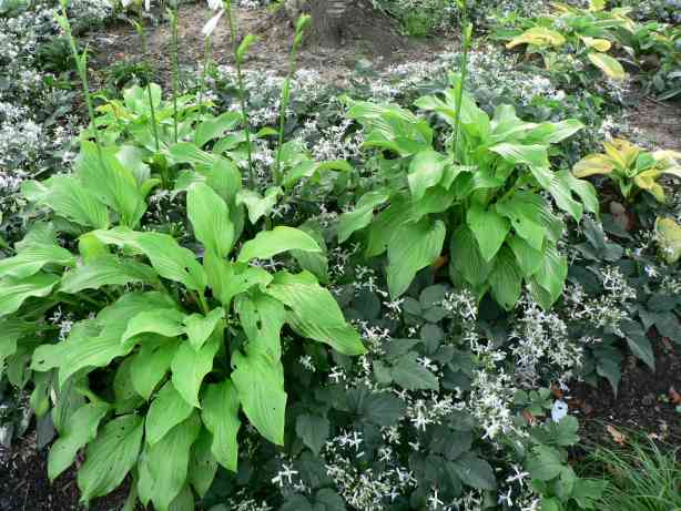 und nochmal bei Huben:schlichte grüne Funkien in einem Bett aus bodendeckender Clematis