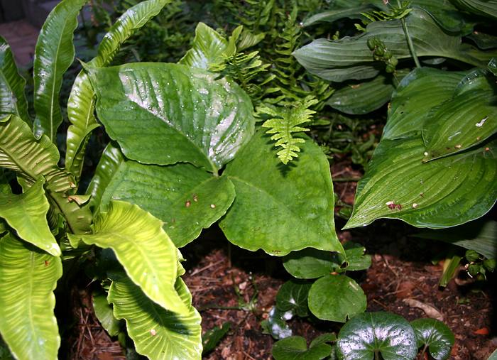 A.ringens ist prächtig gewachsen. Blattdurchmesser ca. 15-20 cm. Ein kleinerA.amurense steht zu seinen Füßen.