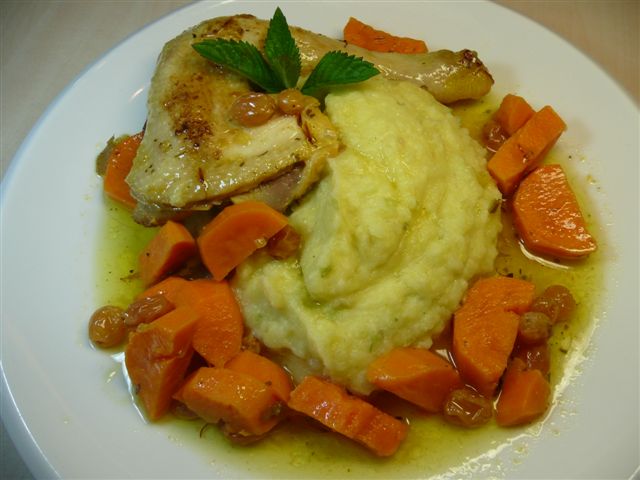 es gab einen Karottensalat, danach einen marokkanischen Poulet-Eintopf mit Süsskartoffeln auf einem Fenchel-Kartoffelpurée