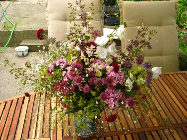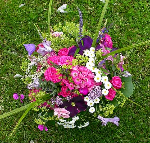 weiters ist noch vorhanden: dunkelrosa achillea und valeriana alliariifoliaansonsten: super!!!und was ist im zweiten strauß?gefülltes Mutterkraut (schöne Sorte!), Sterndolde, auf drei Uhr eine rote Knautia?, Pfirsichblättrige Glockenblume in weiß, Quirl-Salbei, in rosa: eine Bartnelke?, Bartfaden (Penstemon digitalis), Frauenmantel, Schleierkraut ... ein wenig fehlt nochHeuchera, rote Filipendula ?ich hab auch was aktuelles. könnt ihr erkennen was drin steckt?eine seite....