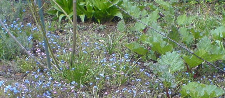 ... als Ausgleich noch ein Bild."Unkraut" Vergissmeinnicht zwischen Rhabarber. Leider ist das Bild nicht aus der Vollblüte.Gute Nacht...