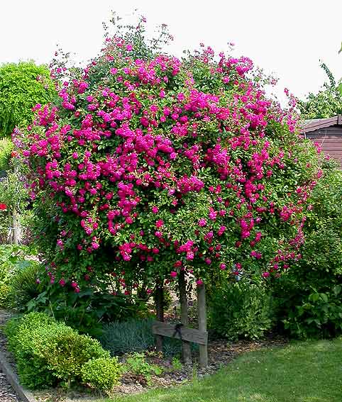 Bevor der thread in der Versenkung verschwindet, hier ein Foto von Super Excelsa als Trauerstamm. Die Rose habe ich 1996 gepflanzt, leider ist sie dann von dem Nachpächter des Gartens beschnitten worden. Dadurch hat sie eine riesige kugelige Krone gebildet, eigentlich sollten die Ranken bis zum Boden reichen.