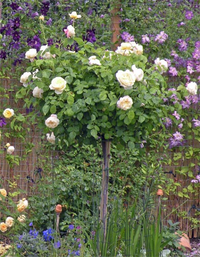 Charlotte, 90 cm-Hochsstamm, zwei Jahre im Kübel gehalten, vor einem Jahr Not-Auspflanzung in den Garten (wäre im Topf schlichtweg vertrocknet) . Wird im zeitigen Frühling rigoros auf maximal 3 Augen geschnitten. Macht leider die typischen Austinschen Peitschentriebe. Das Foto habe ich erst nach dem Abschneiden der zahlreichen, leider vom Starkregen völlig zermatschten, Blüten aufgenommen.Liebe Grüße, BarbaraFrage: hat jemand eine der folgenden Rosen auf Hochstamm und kann darüber berichten: Jacques Cartier (weiß), Rose du Roi, Mme Knorr - die würde ich mir nämlich gerne noch anschaffen, wenn sie geeignet sind.