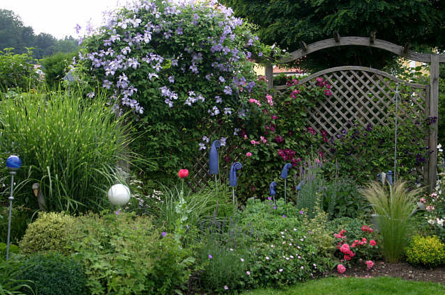 Gut zu wissen, Susanne! Da hätte ich doch noch ein paar Plätzchen dieser Art ... ;)Eine Clematis, die mir auch heuer wieder ausgesprochen gut gefällt, ist Night Veil mit zierlichem Laub und sehr üppiger Blüte: