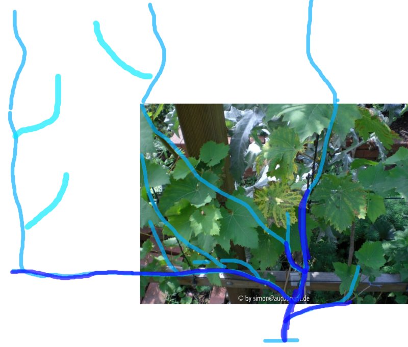 Hi!Also das sind eher ältere Blätter betroffen.Und ja, ich hab sie kaum geschnitten, hab mich nicht getraut ::)Ich hab mal das Bild von oben editiert und die Triebe eingezeichnet (das andere sind bambusstäbe).Die von letztem Jahr sind dunkelblau, Heller = diesjährig.Blütenansätze hat sie nur an 3 kleinen Ansätzen. Letztes Jahr hatte ich eine Traubemit ~20 Trauben drangelassen (wollte probieren