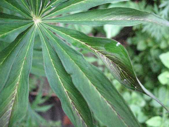 Dummerweise sehen die Blätter der daneben stehenden Hosta 'Pineapple Upsidedown Cake' genauso aus wie die Blütenspitze der Arisaema ,hat aber nichts miteinander zu tun. Der Stängel ist glatt und hat dunkelrötlich-braune vertikale Striche. Ein kleineres Blatt habe ich auch noch.