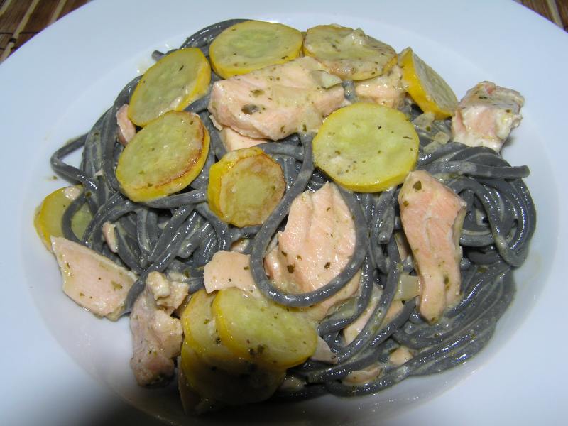 gerade gabs sepiaspaghetti mit einer soße aus lachs, den ersten zwei kleinen gartenzucchinis, weißwein, sahne und grünem pesto. dazu den vorerst letzten pflücksalat.