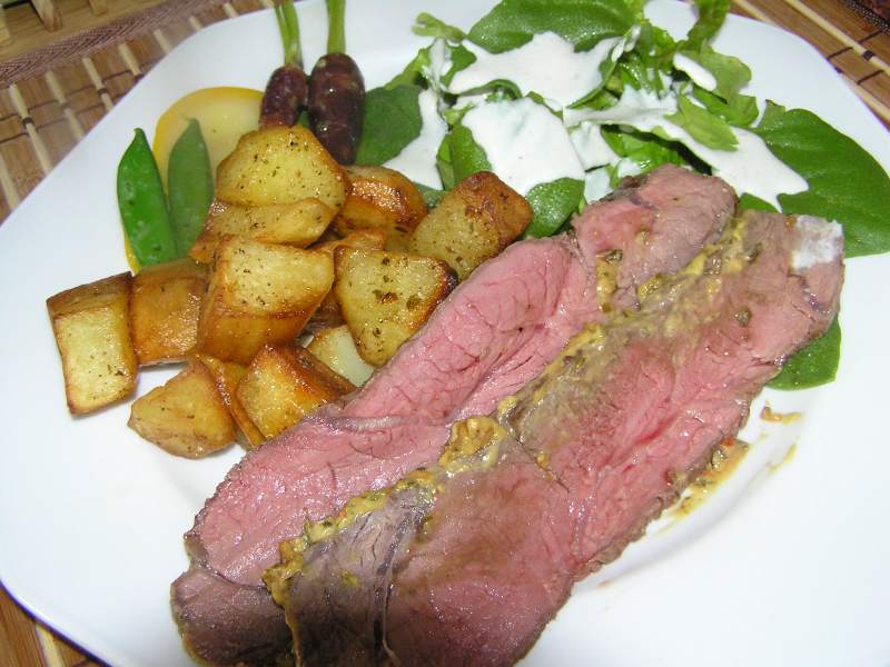 mit bratkartoffeln, gartensalat (batavia u eisperlen) mit blue-cheese-dressing und ein wenig zartes gartengemüse.
