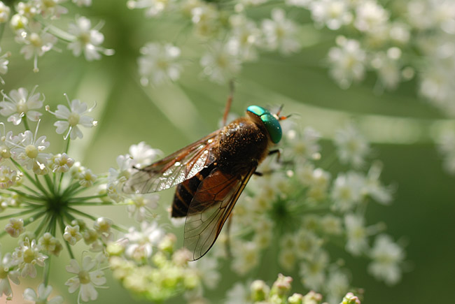 Diese grünäugigen, recht großen Fliegen saßen immer auf den Blüten des Laserkrautes, vielleicht kennt sie jemand.