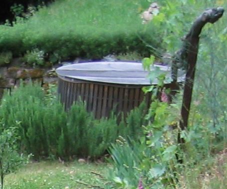 Schau mal, das ist eines meiner 2000-Liter-Fässern. Das Wasser muss im Winter nicht abgelassen werden. Ich habe diese Fässer von der Firma Beckmann.