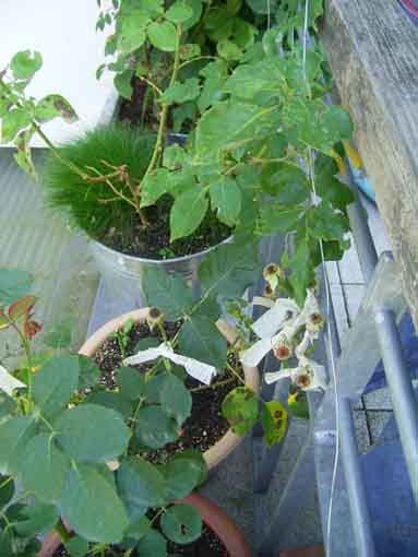 .Die Bouquet d'Or hat zwar wirklich ganz wunderschöne Blüten, aber sehr reichblühend ist die bei mir nicht, jetzt produziert sie die 4. Blüte ihres Daseins.Die Florence Delattre hat auch von unten her über die Hälfte ihres Laubs abgeschmissen. Bei den andere Rosen sind fast überall die Blätter total zerfressen, Neuaustriebe abgefressen, und mein Albéric barbier hat große Lücken, blüht wenig und nicht schön. Gut, selber schuld, Kübel viel zu niedrig, Stacheln in Sitzhöhe abgebrochen (schäm) und halt der Stammsitz der Dickmaulrüssler