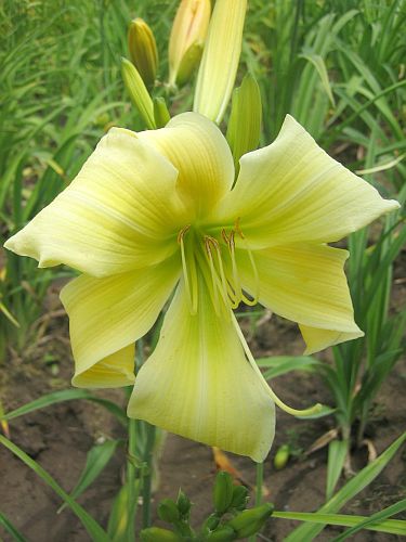 Die gibt es zu hunderten, nur kennt sie niemand.Gewiss sind die Engländer Meister der Staudenpflanzungen und sogenannten ‚drifts‘, für die sich großblütige runde gerüschte Sorten natürlich weniger eignen. Aber was ich 2001 an Taglilien in Wisley und 2002 bei der National Collection auf der Isle of Wight zu sehen bekam, war schon mehr als traurig. Die Engländer haben die Taglilienzüchtung schon vor vielen Jahrzehnten in die Hände der Amerikaner übergehen lassen und sich offenbar weitgehend abgekoppelt von den Entwicklungen.(Mal nur als Anregung nebenbei. Auch Gartengestalter könnten sich ja mal Gedanken machen, wie ‘barocke‘ Taglilien in die Gestaltung eines Gartens einzubinden sind. Gärten müssen ja nicht immer nur aus Staudenbeeten bestehen. In formaleren Anlagen könnte ich mir aufwendigere Einzelexemplare durchaus vorstellen. Aber wir haben ja seit etlichen Jahren die "englische Welle".…gute Sorten, mit denen sich Staudenpflanzungen machen lassen.
