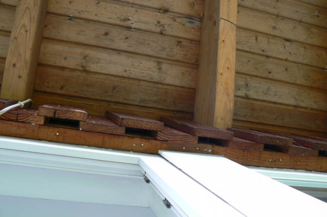 Und hier eine typische Niststelle. Die Mauersegler nutzen die Spalten zwischen der Holzverschalung und dem Dachüberstand. Hinter der Holzverschalung scheinen gerne kleine Fledermäuser zu übernachten und im Winter auch Meisen. Dort, wo ausreichend Platz ist, haben sich auch schon mal Hornissen und Wespen eingenistet. Gartenbaumläufer haben bei uns auch schon zweimal genistet, allerdings an den Seiten ohne Dachüberstand (habe ich noch was vergessen???