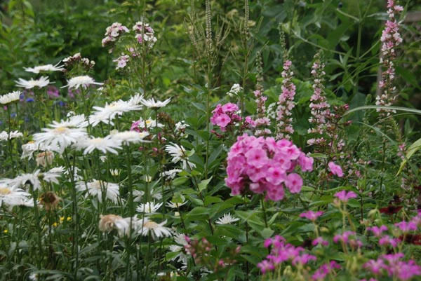 . Es ist ja noch nicht August, aber einige Pflanzen, die jetzt schon schön sind, halten bis am ersten August sicher durch. Dazu gehörten sämtliche Agastachen (in sonnigen Beeten sehr wichtig!) und eventuell auch Veronicastrum, wobei ich nicht weiß, ob das in wärmeren Lagen nicht schon früher dran ist.Außerdem Blutweiderich; ich zeige euch hier die rosa Sorte 'Blush' (rechts hinten die Blütenkerzen).
