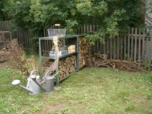 brennholz im garten zu lagern heißt ja auch, es vor regen zu schützen. wenn man nun keinen tiefen dachüberstand hat oder sonstwelche dächer - manchmal sieht man ja, daß die leute in ihren carports holz lagern - bleibt oft nur, das holz zu stapeln und mit einer plane o.ä. abzudecken. das wollte ich nicht, ich finde das nicht schön.so kam ich auf die idee, eines dieser billigen verzinkten regale im baumarkt zu kaufen. zinkblech gibt es bei uns am haus und auch bei den gartenmöbeln schon, und es ist ein ehrliches material, das altert. für knapp 30 euro ein regal gekauft und die beiden teile nicht ineinandergesteckt, um 1,90 m höhe zu erreichen, sondern als "sideboard" nebeneinandergestellt.das regal steht jetzt quer im hinteren gartenteil und trennt optisch einen arbeitsbereich vor den kompostern ab (die alten kaputten komposter werden wir im herbst auflösen und neue hinstellen). vor dem regal will ich im laufe der zeit noch ein beet anlegen, in die nähe des gartenzauns auch noch ein gehölz pflanzen.die konstruktion im foto wird noch erweitert um ein oder zwei teile, wenn wir mehr holz bekommen. die stirnseite steht nach westen, also zur wetterseite bei uns, einen ordentlichen regenguß gab es auch schon - das holz blieb trocken. und außerdem hat man jetzt einen platz, wo man seine bierflasche beim kompost-umsetzen abstellen kann...
