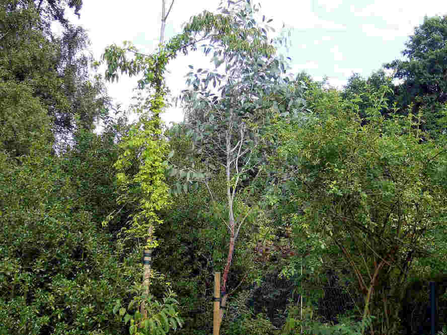 Hallo Ismene,leider steht mein "Böser Willi" so verschränkt mit anderen Arten, dass man ihn auf dem anliegenden Bild nicht deutlich herauskennt. Er entwickelte sich vollautomatisch zu einem Hochstamm und kommt nun links mit der Krone einer Diospyros lotus (links) ins Gehege (die so hoch ist, dass ich ein Fernglas brauche, um zu erkennen, ob sie blüht). Deren Stamm wird von Akebia quinata umsponnen.Viel ist ja nicht zu erkennen, aber vielleicht etwas zu erahnen.mvG - Guter Heinrich