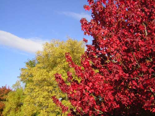 Ist ja ein toller Kontrast, Wolfgang. Zu dem Thema hab ich auch noch ein Bild. Eine gelbe Esche und daneben ein roter Amberbaum, die sich dazu noch beiden schoen vom Himmel abheben.