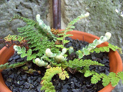 Hier ein paar Farne, die ich von den Kanarischen Inseln mitgebracht habe. Ob winterhart vermag ich nicht zu sagen. Aber sie sind im Haus (kühles Treppenhaus) durchaus eine Zierde.Dieser hier ist ein extrem langsam wachsender Farn, der aus einem daumendicken Rhizom sprosst. Zwei Jahre lang tat sich gar nichts, so dass ich schon dachte, das Rhizomstück sei abgestorben.Keine Ahnung, wie Art heißt. Sie ist gewiss nicht endemisch auf den Inseln.