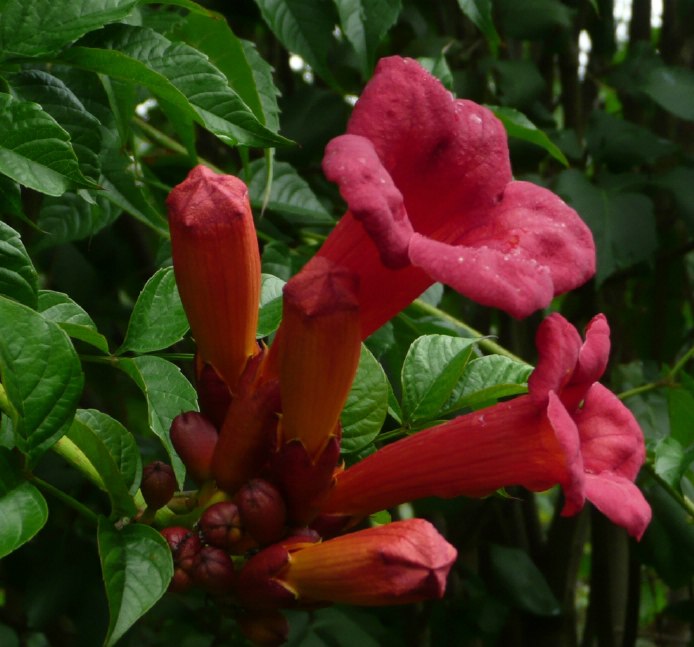 Die Campsis blüht seit ein paar Tagen. Sie müßte gut 30 Jahre alt sein und verhüllt den nicht besonders hübschen Geräteschuppen.