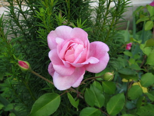 Na ja, so richtig begeistert hört sich das ja nicht an. Als möglicher Kandidat bleibt sie mal auf der Liste, aber vielleicht gibt es dann einen anderen Favorit...Die Mme Alfred Rougemont stand letztes Jahr um diese Zeit völlig nackt da und ich war wenig begeistert von ihr, zumal sie auch nur wenige Blüten machte, die nicht so schön geformt waren. Jetzt im 2. Standjahr hat sie sich recht berappelt. So, dass sie nun etwas mehr beachtet wird von mir. Die Blüten sehen mehr oder weniger wohlgeformt aus. Sie duftet. Den SRT hat sie noch nicht ganz überwunden. Ist aber noch völlig grün und nur wenig befallen. Alles in Allem ist sie auf dem Weg der Besserung. Ein bischen hat sie auch an Höhe zu gelegt. Wie es scheint gehört sie zu denen, die Zeit brauchen zum Einwachsen. Für nächstes Jahr erwarte ich ein bischen mehr Höhenwachstum und noch etwas mehr Blüten.