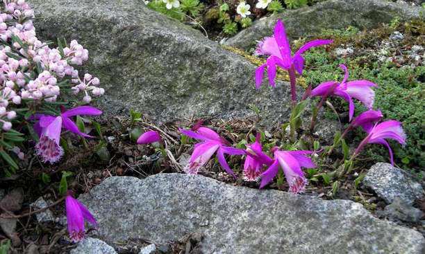...und wenn es noch eines Beweises bedarf, dass Pleione limprichtii eine absolut harte und konkurrenzstarke Pflanze ist - hier ist er! Ich habe vor etlichen Jahren einige kleine Bulben in das Wurzelgeflecht von Zwergrhodos, Farnen und Waldsauerklee gedrückt und dann vergessen. Seht, was daraus geworden ist.