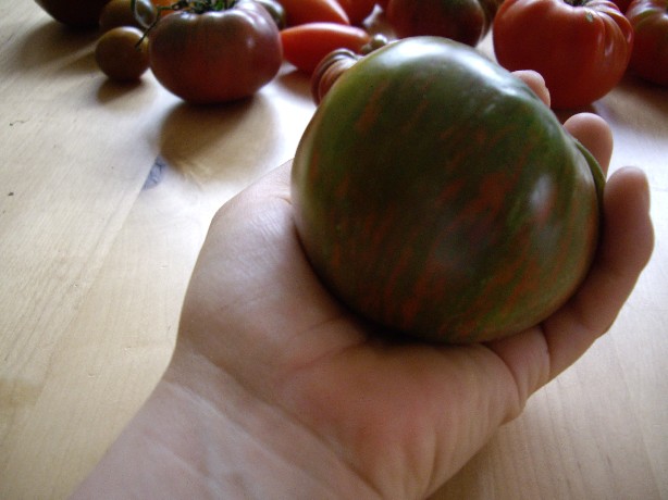 hallo fairy, dein erntebild sieht super aus und ich finde es toll, dass du gleich die namen dazugeschrieben hast!ich wundere mich nur über deine evergreens, auch schon auf deinen früheren bildern sahen sie -zwar wunderschön- aber für mich doch ungewöhnlich rot/grün-gefärbt aus. kann es sein, dass sich da was eingekreuzt hat? bisher kannte ich sie nur grün/gelb/ocker-farben.guck mal hier im tomatenatlasdie evergreen schmeckt uns übrigens ausserordentlich gut.liebe grüsse von leni wHallo,ich habe gestern mal mit ernten der Tomaten ausgesetzt, heute hat es sich dafür wieder gelohnt:http://www.pic-upload.de/06.08.08/j483ms.jpg