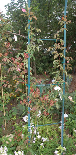 Kai Eric: Dr. Rouge wäre mit Papillon zusammen an den Bogen gekommen. (Diese Papillon ist eingegangen, zu rein wissenschaftlichen Zwecken haben wir aber noch zwei andere). Er ist erst etwa 50 cm hoch, braucht also noch eine Weile keinen Bogen, zur Zeit Blütenlos. Wächst eher moderat, aber mit neuen Austrieben. Papa Gontier hingegen wächst sicher noch über den Bogen von 250 hinaus dieses Jahr, wenn er so weiter macht. Allerding kämpft er dauernd mit Mehltau, obwohl er gut luftig steht. Zuoberst sieht man einen farbigen Blütenknopf. Nicht nur in die Höhe, sondern auch eine gute Verzweigung mit vielen Seitenästen zeigt er.